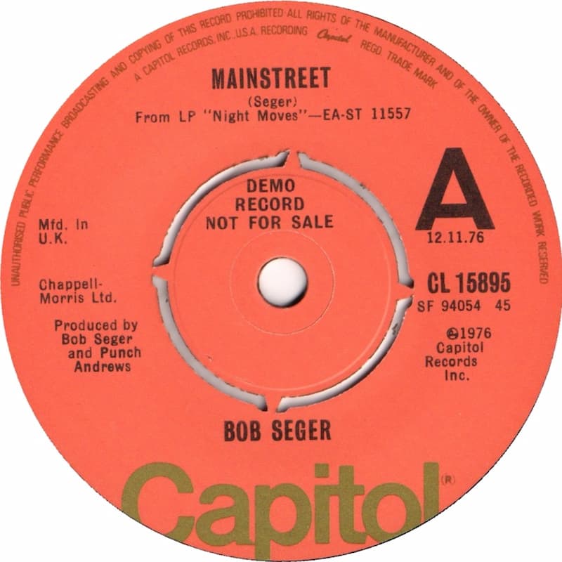 “Mainstreet” arrived in April 1977 as the second single from Bob Seger’s breakthrough album Night Moves, distilling his gift for cinematic detail and bar-band warmth into a quietly epic ballad. Issued by Capitol with “Jody Girl” on the B-side, the track plays like a dawn reverie: reflective tempo, unshowy rhythm section, and a melody that moves with the patience of memory. Coming on the heels of the Top-10 title track, it helped broaden Seger’s national profile beyond the Midwest circuits that had long championed him.